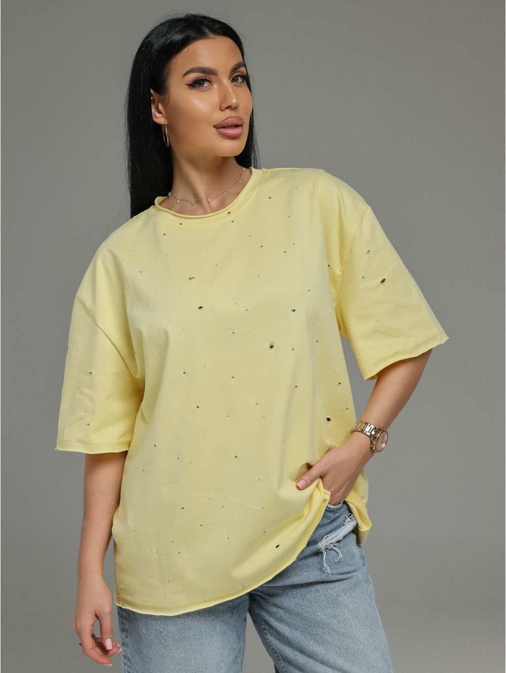 Характер модели:Лаконичная, но с характером. Футболка из дорогой ткани с интересной фактурой (деворе) и современной обработкой края. Она подойдёт для создания как минималистичных образов (с джинсами, брюками, шортами), так и более сложных многослойных сочетаний. Идеальный выбор для тех, кто ценит качество и небанальные детали.