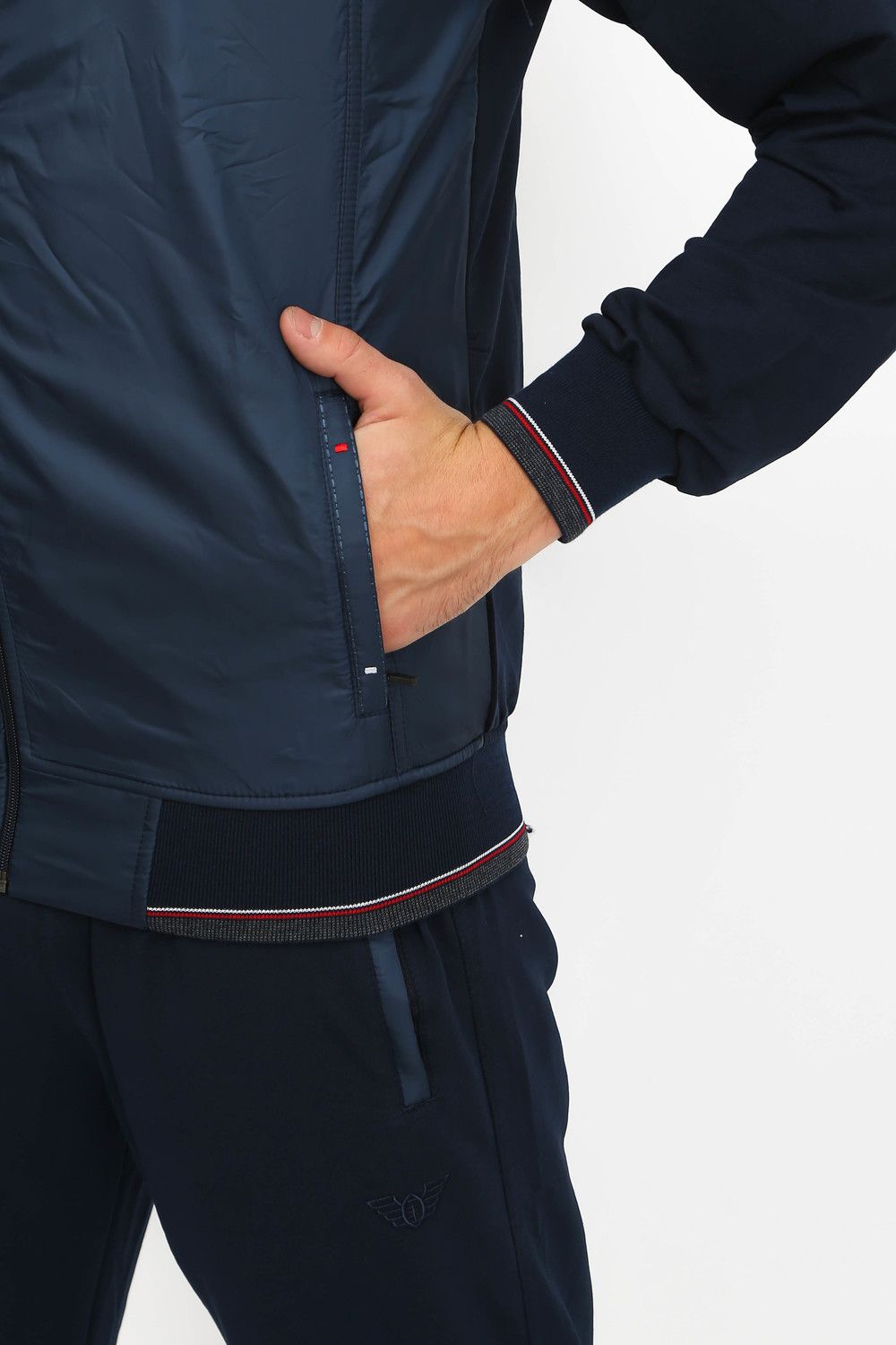 Мужской спортивный костюм выполнен из трикотажа с добавлением плащевки. Карманы брюк и кофты на молнии с декоративной листочкой. Низ и рукава кофты на манжетах, брюки прямого кроя, на талии резинка внутри которой находиться веревка для регулирования, воротник стойка. Костюм отлично подойдет для тренировок, для повседневной носки, дачи и дома.