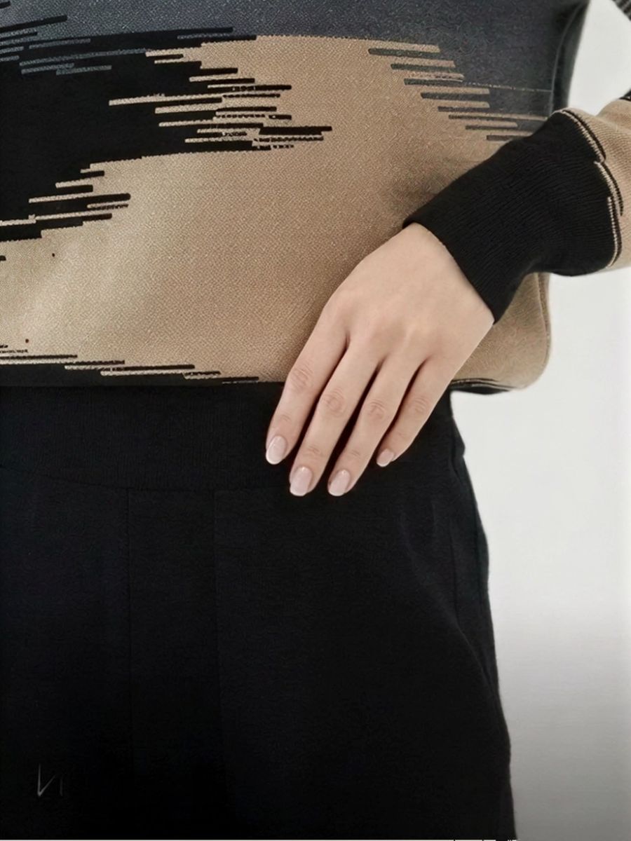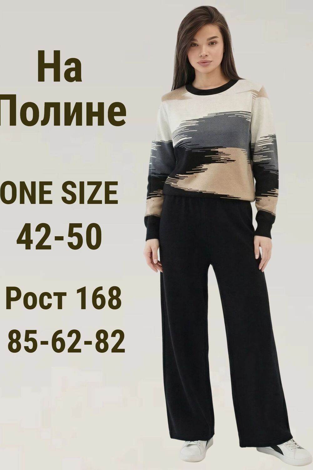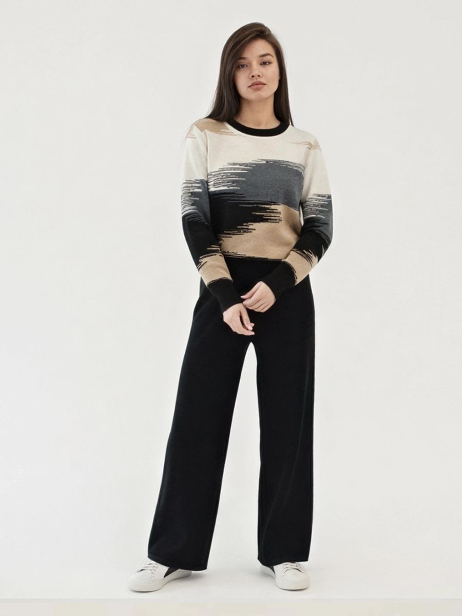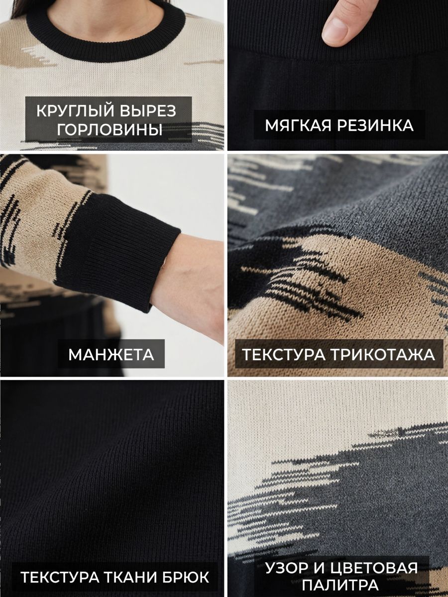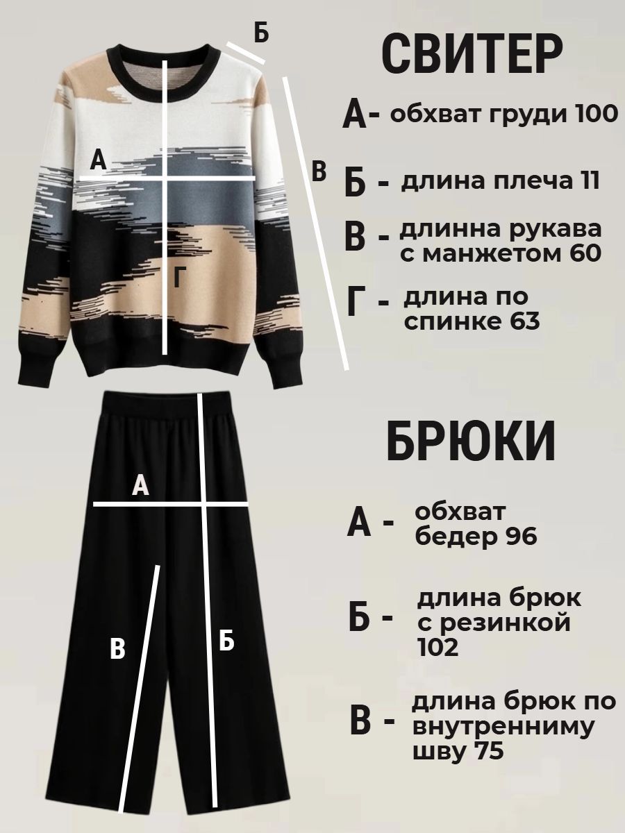 Этот тёплый женский вязаный костюм — гармоничный комплект из свитера и брюк, выполненный из плотной, мягкой и эластичной пряжи (состав: 30% хлопок, 40% вискоза, 30% полиэстер), который надёжно сохраняет тепло и при этом приятно прилегает к телу. Свитер свободного кроя визуально стройнит, манжеты и нижняя кромка обработаны резинкой для лучшей посадки и сохранения формы. Плечи оформлены со скосом или лёгким «полупритёком» для комфортной посадки на фигуры разных типов; брюки средней посадки с эластичным поясом и внутренней мягкой тесьмой или шнурком обеспечивают индивидуальную регулировку, прямой силуэт свободно сидит, благодаря эластичности материала изделие «тянется» и адаптируется под параметры от 42 до 50 размера. Аккуратные декоративные швы, узорная вязка, легко сочетаются с верхней одеждой и аксессуарами; материал и плотная вязка делают костюм универсальным для осенне-зимнего периода, весны и прохладного лета— он отлично подойдёт как для прогулок и поездок, так и для уютных домашних вечеров или неофициальных встреч; уход: рекомендована деликатная стирка руками или в машине на щадящем режиме при температуре не выше 30°C, сушить в расправленном виде на горизонтальной поверхности, не отбеливать, при необходимости возможна бережная химчистка; благодаря продуманной посадке и использованию качественной пряжи комплект сохраняет форму и внешний вид даже при регулярной носке, подчёркивает женственность без лишней вычурности и станет практичным элементом гардероба тех, кто ценит комфорт, тепло и стиль.