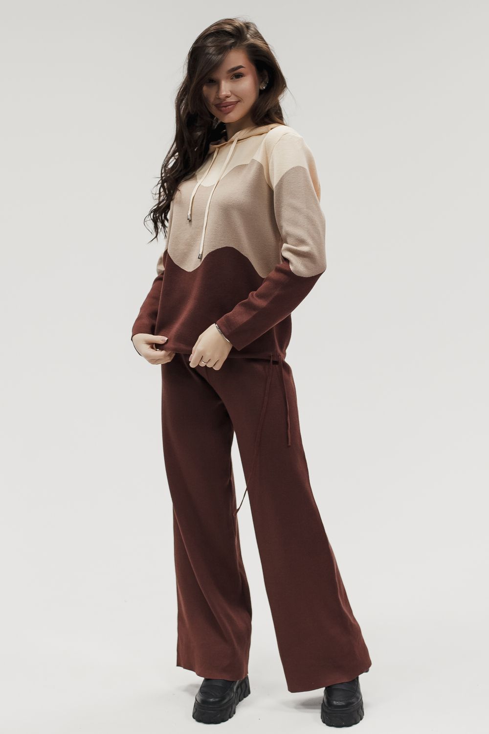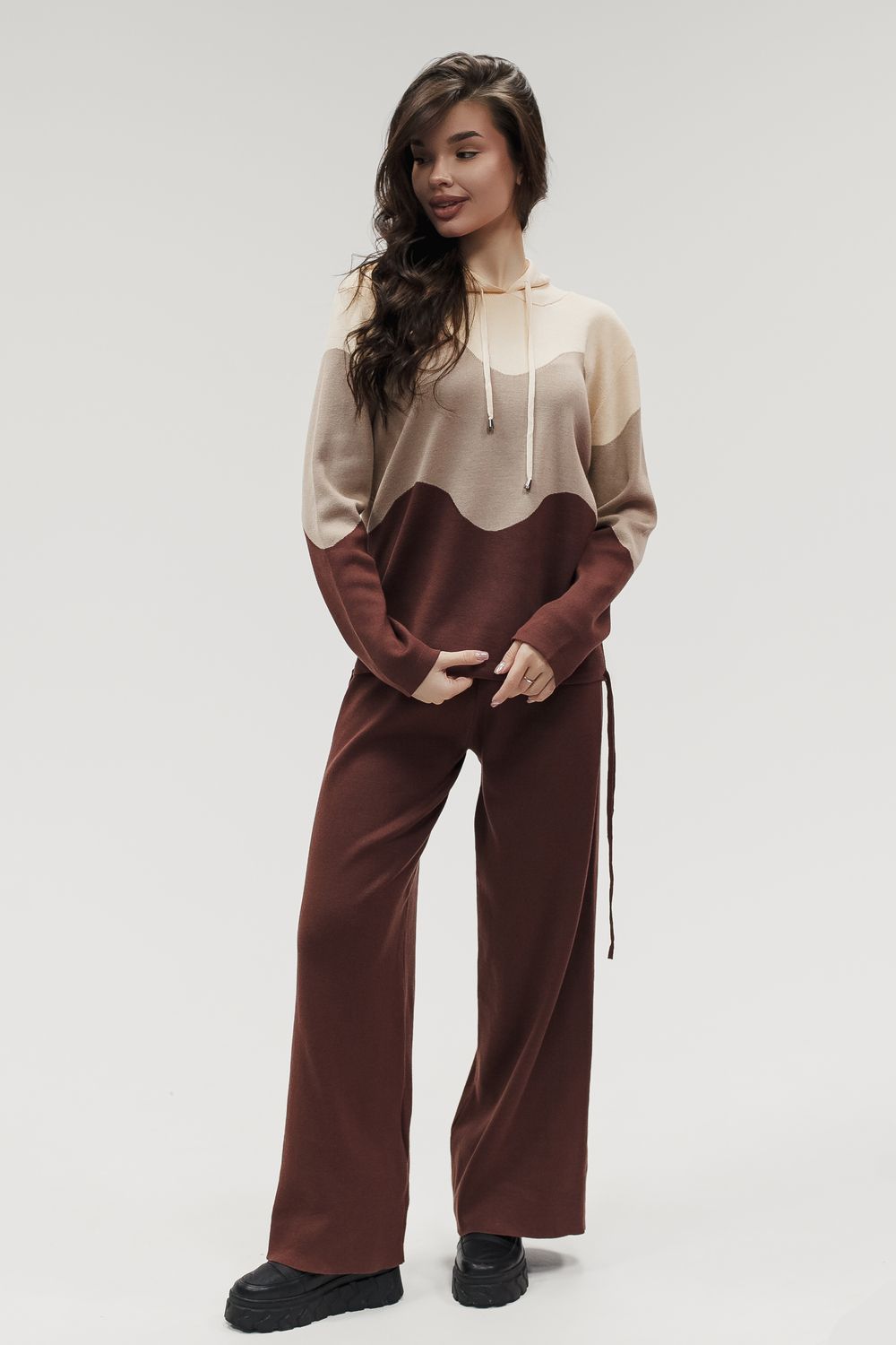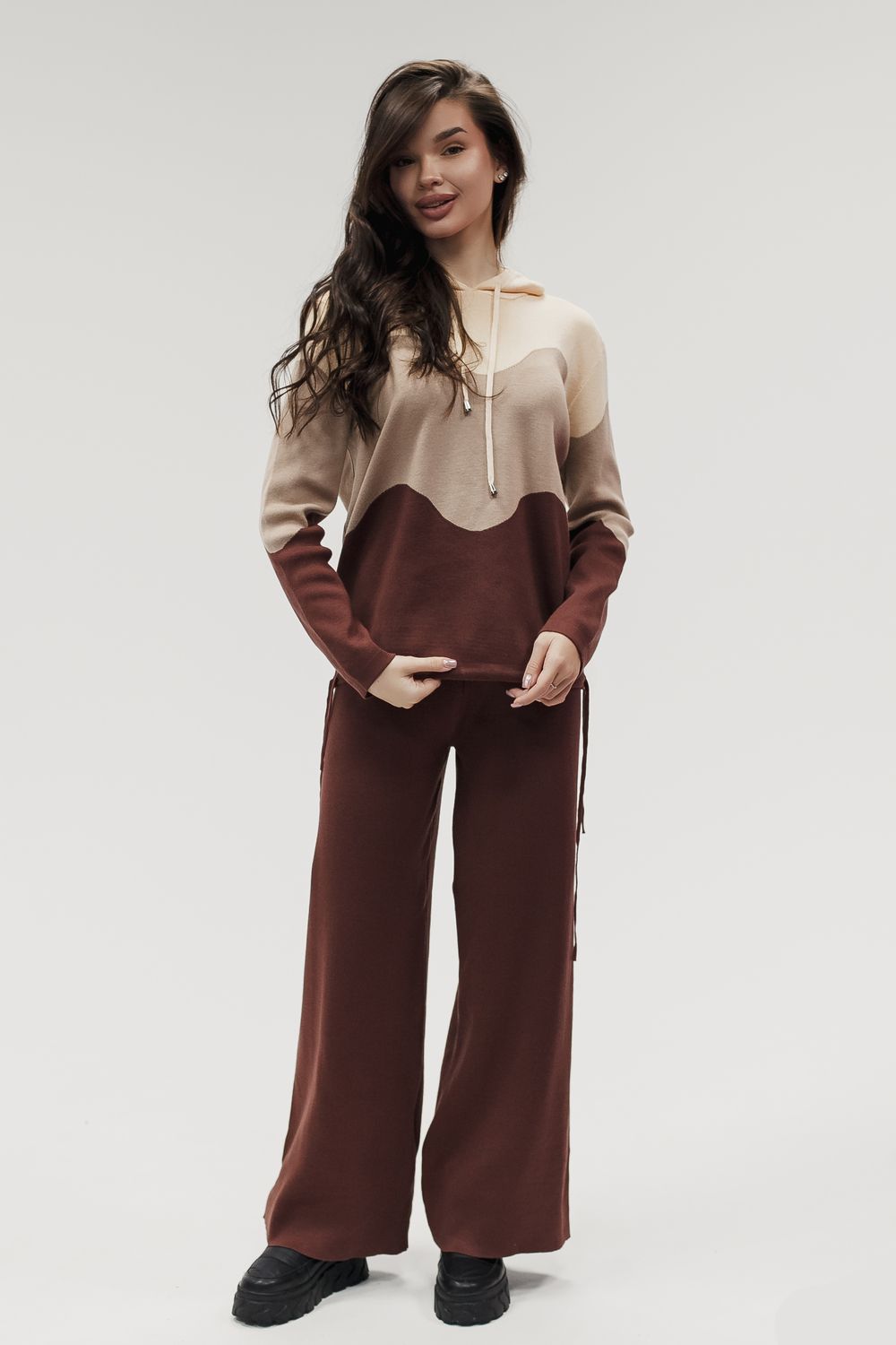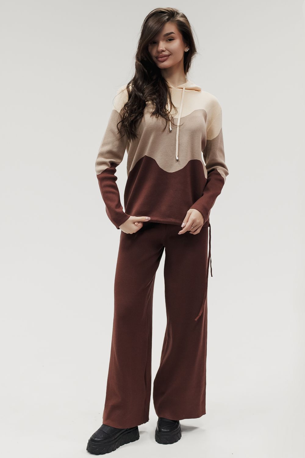 Вязаный костюм трикотажный с брюками "Волна" - коричневый