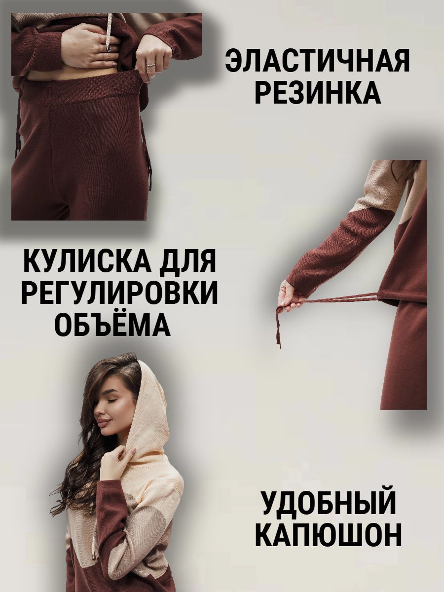Крой кофты свободный, с капюшоном, кулиской по нижнему краю и эластичными манжетами; крой брюк прямой силуэт, средняя посадка, эластичный пояс. Особенности: кофта с регулируемым капюшоном и кулиской, брюки без карманов. Уход: деликатная стирка при температуре не выше 30∘C, сушка в расправленном виде на горизонтальной поверхности, не отбеливать, при необходимости бережная химчистка. Благодаря эластичному материалу костюм адаптируется под параметры фигуры и комфортно сидит,а лаконичный дизайн делает его универсальным он легко вписывается в разные образы и сочетается с любой обувью, от кроссовок до ботинок. Минималистичный крой и отсутствие лишних деталей подчёркивают сдержанный стиль и делают костюм практичным решением на каждый день