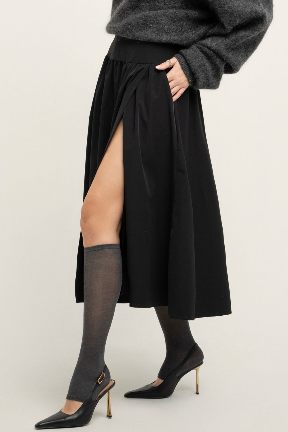 Юбка миди с летящей тканью и разрезом спереди станет прекрасным дополнением вашего гардероба. Модель выполнена в комфортном А-силуэте со средней посадкой, что обеспечивает удобство для повседневного ношения. Застежка на молнию облегчает надевание, а кокетка добавляет образу легкости и динамичности.