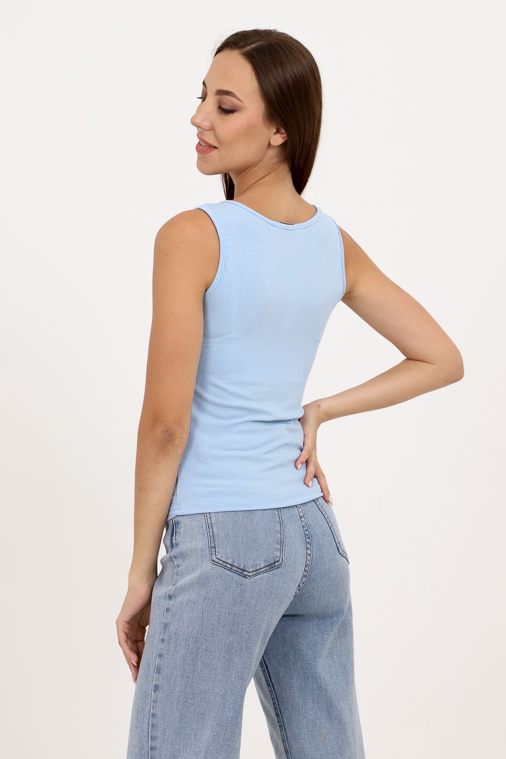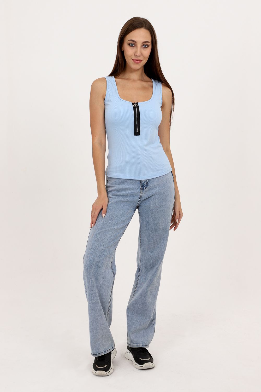 Майка из кашкорсе, прилегающего силуэта, средней длины, с квадратной горловиной. В верхней части полочки обработана молния. Горловина и проймы майки обработаны бейкой из основного полотна.