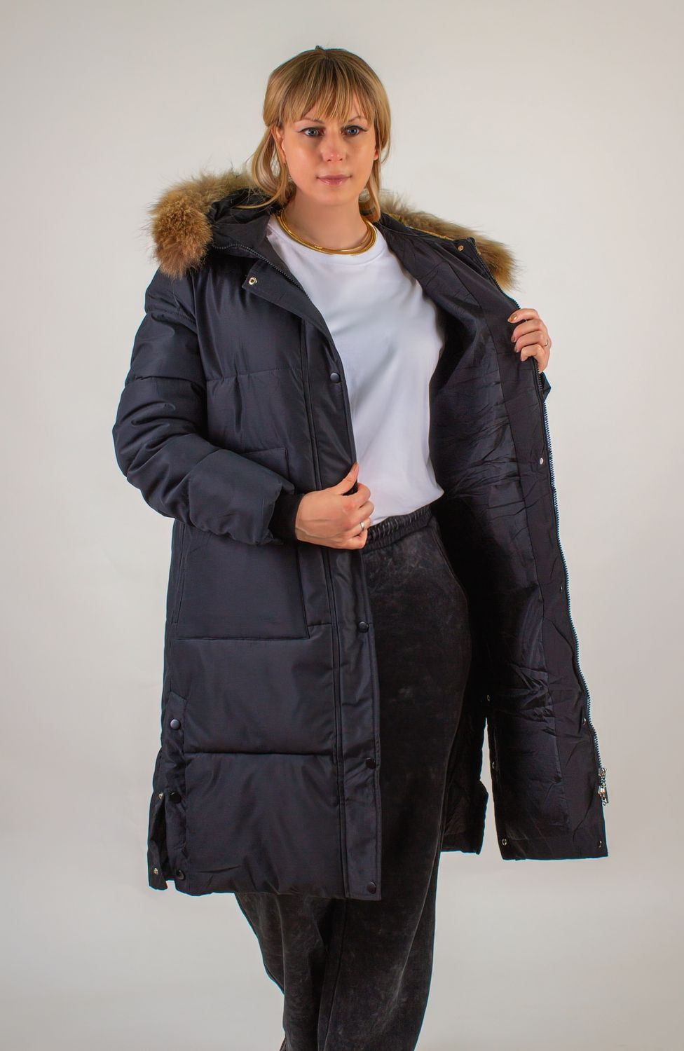 Капюшон парки декорирован меховой опушкой из енота. Мех легко отстёгивается, позволяя менять образ и уровень утепления. Передняя застежка – двухзамковая молния, дополненная ветрозащитной планкой на кнопках, не пропускающей холод. По бокам расположены глубокие карманы с тройной отстрочкой, в которых ваши руки всегда будут в тепле, а ценные мелочи – в сохранности.